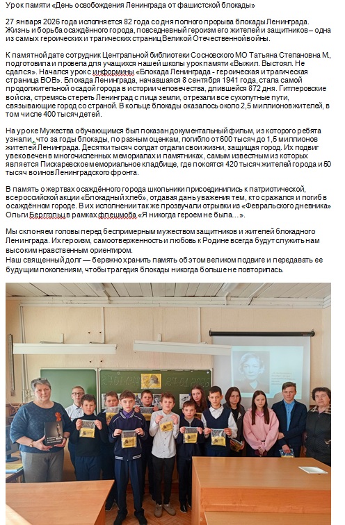 В память о жертвах осаждённого города школьники присоединились к патриотической акции «Блокадный хлеб», отдавая дань уважения тем, кто сражался и погиб в осаждённом городе. В их исполнении так же прозвучали отрывки из «Февральского дневника» Ольги Берггольц в рамках флешмоба «Я никогда героем не была…».